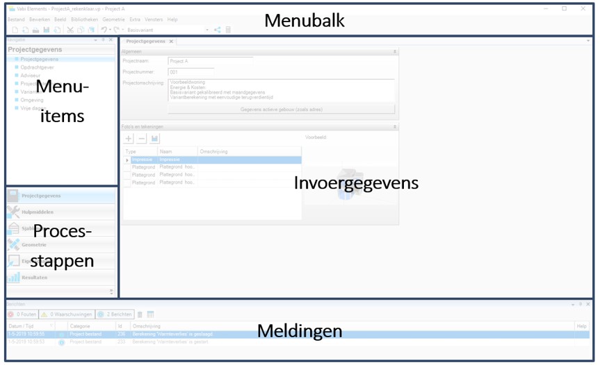 Vabi Elements heeft een standaard schermopbouw bestaande uit de menubalk, processtappen, menu-items, invoergegevens en meldingen. Deze is voor alle schermen in Vabi Elements hetzelfde opgebouwd. De menubalk bevat acties als het openen van een nieuw project, opslaan, kopiëren, knippen en plakken.