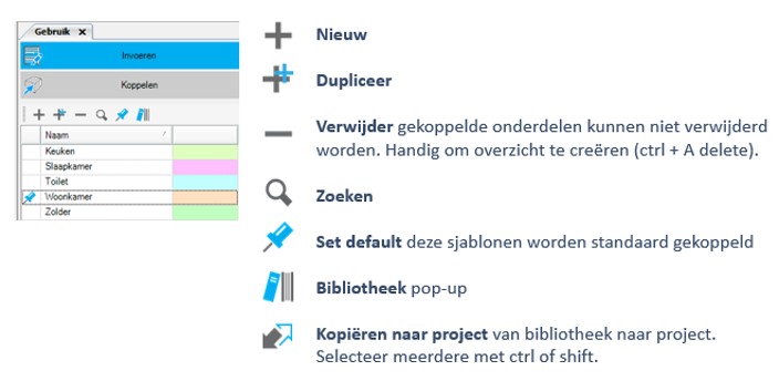 Boven elke lijst zijn een aantal knoppen voor het invoeren en het versnellen van de invoer. Je maakt nieuwe items aan en je kunt items kopiëren en verwijderen. De default knop zorgt ervoor dat het geselecteerde sjabloon standaard gekoppeld wordt aan de ruimten. Dit kan handig zijn wanneer het bijvoorbeeld een kantoor betreft met veel kantoorruimten.