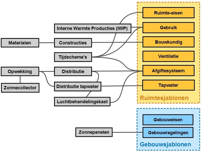 Andere hulpmiddelen zijn bijvoorbeeld de tijdschema’s, Interne Warmte Producties (IWP), opwekking, luchtbehandeling en distributie. De onderstaande afbeelding illustreert, welke hulpmiddelen aan welke sjablonen moeten worden gekoppeld.