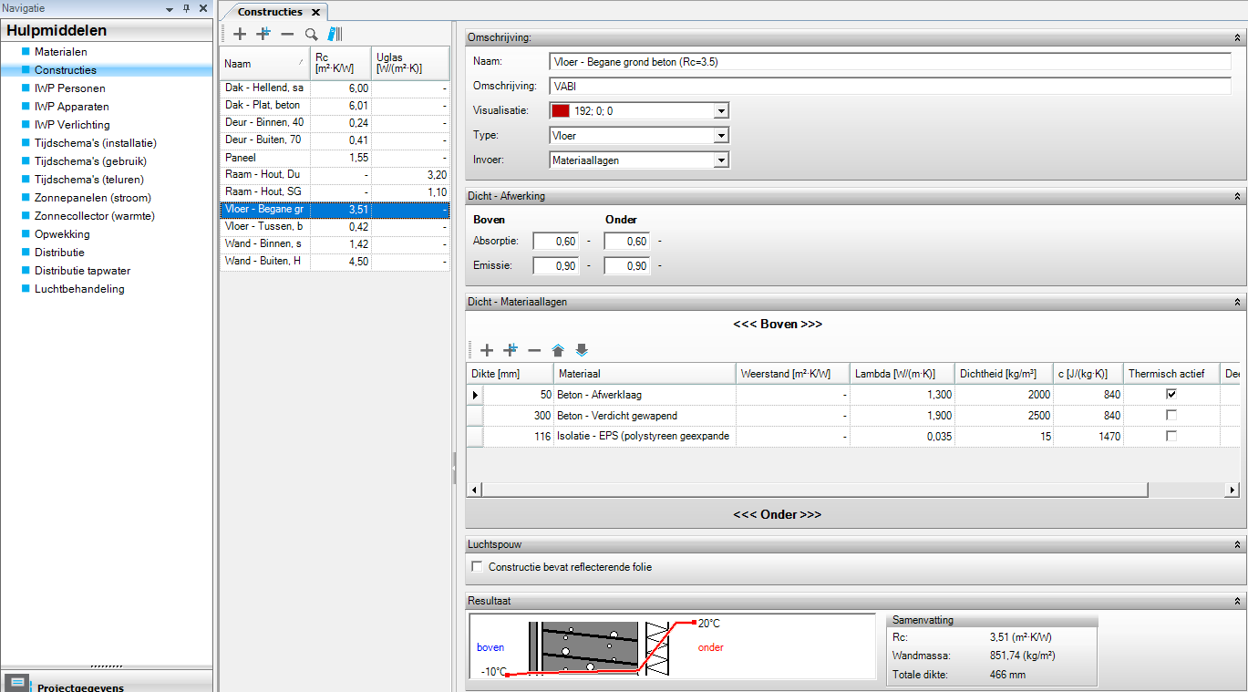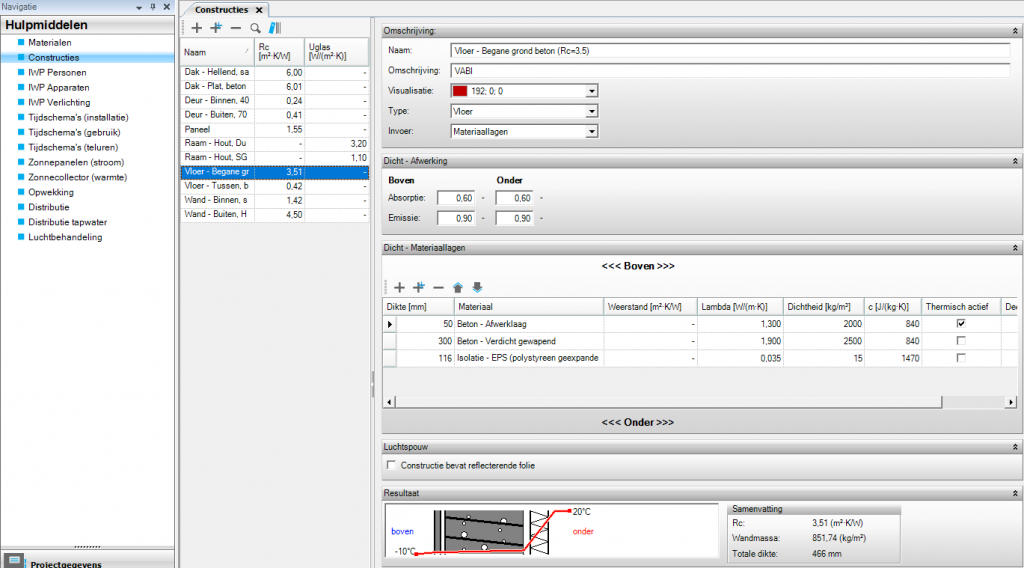 Onder hulpmiddelen vind je bijvoorbeeld materialen en constructies. De constructies die zijn aangemaakt koppel je aan een bouwkundig sjabloon, waarbij je voor elk type constructie een eigen constructie toewijst. Het is een pakket van verschillende hulpmiddelen in één, die daarna aan een ruimte kunnen worden toegewezen.