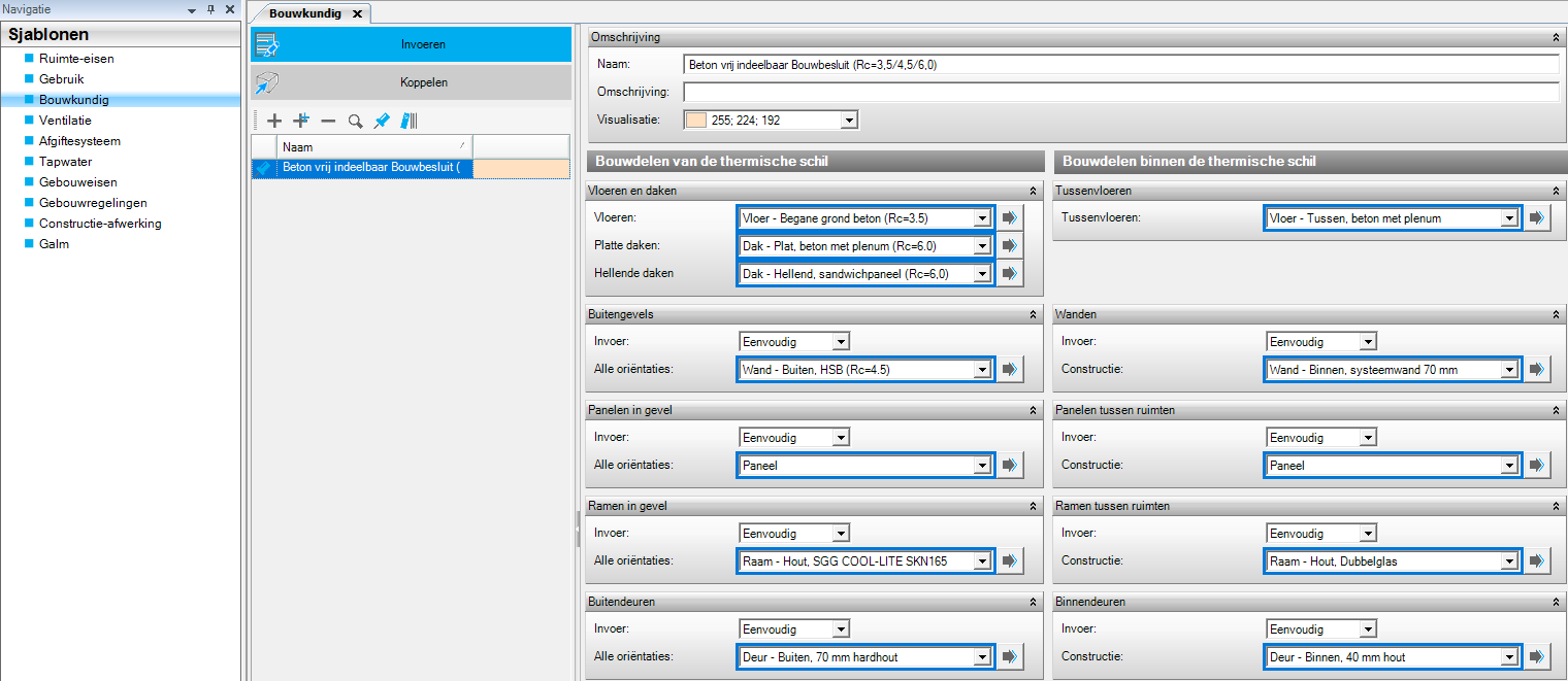 De verschillende constructies die zijn aangemaakt kun je hier samenvoegen tot één bouwkundig pakket. Wanneer dit sjabloon gekoppeld wordt aan een ruimte wordt automatisch herkend van wat voor een soort constructie er sprake is. Het is ook mogelijk om constructies op uitgebreide manier in te voeren, waarbij er gekeken wordt naar de oriëntatie van de constructies in de geometrie.