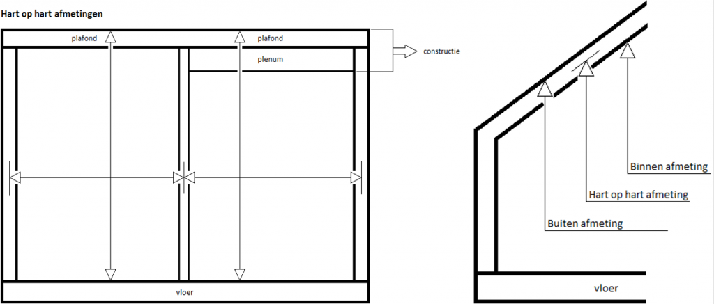 Vabi Elements rekent met een vaste maatvoering. Voor zowel platte als schuine daken geldt een hart-op-hart (h.o.h.) afmeting. In onderstaande afbeeldingen is hier een schematische weergave van weergegeven.