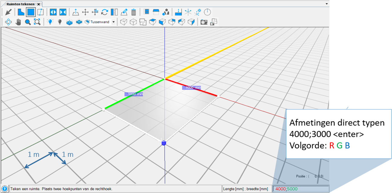 Als de tekenfunctie rechthoek of polygoon geselecteerd wordt, verschijnt er automatisch een grid zoals rechts op de afbeelding weergegeven. Elk vak op de grid is 1 bij 1 meter. De afmetingen kunnen rechts onderin ingevuld worden. Ga altijd in de richting staan waarheen je wilt tekenen en klik vervolgens op enter.