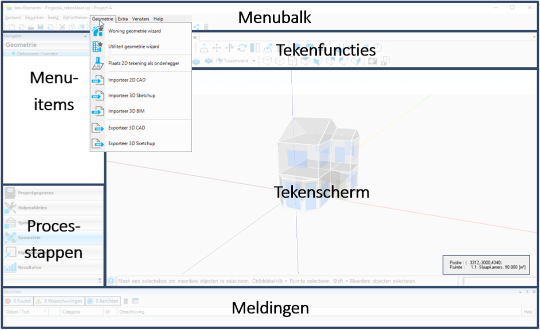 Wanneer het tekenscherm in Elements wordt geopend, ziet de schermopbouw eruit zoals in de afbeelding hiernaast weergegeven. In het tekenscherm kan door gebruik van de tekenfuncties een geometrie getekend worden. Ook is in het tekenscherm de ruimtenaam en positie te zien. Onder het kopje ‘meldingen’ verschijnen eventuele foutmeldingen, die zich voordoen bij het maken van de geometrie.
