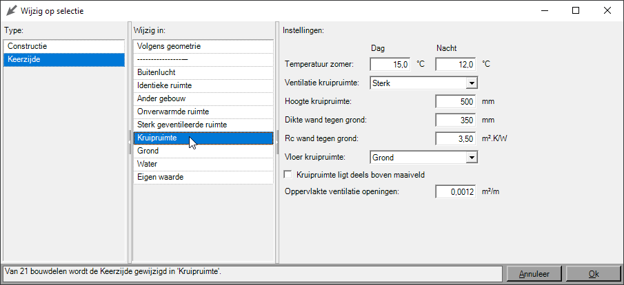 Wanneer een deel van je gebouw grenst aan bijvoorbeeld een ander gebouw of kruipruimte, zou je deze in de geometrie erbij kunnen tekenen. Je kan ook de keerzijde van de bouwdelen die aan dat gebouw of die kruipruimte zouden grenzen wijzigen.
