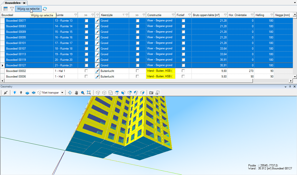 Het bouwdelenscherm laat een lijst zien van alle bouwdelen. Je ziet dat alle constructies nu automatisch toegewezen zijn. Ook is hier het geometrie-hulpscherm beschikbaar. In het bouwdelenscherm kun je per bouwdeel zien welke keerzijde, constructie, oppervlakte oriëntatie en helling het bouwdeel heeft. Je kunt ook een negge (ruimte tussen voorkant gevel (metselwerk) en voorkant kozijn) invullen, als hier sprake van is (voor zon-instraling gebouwsimulatie en koellast).