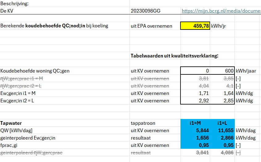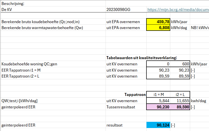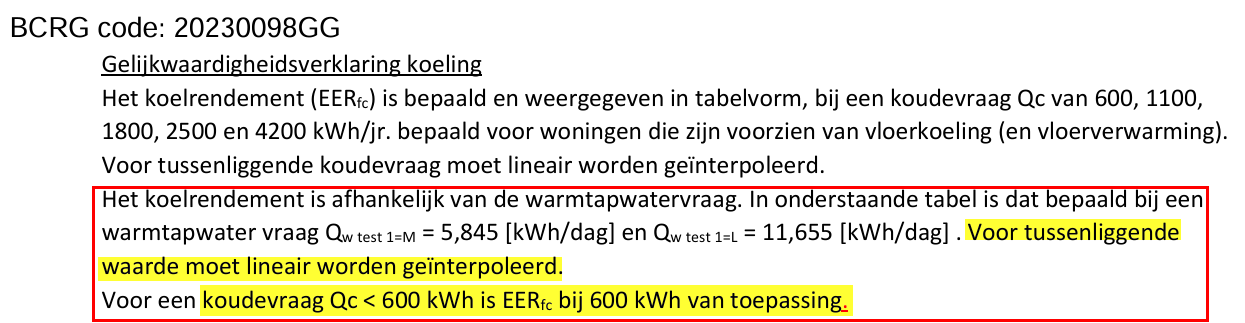 Let op: Bij een koudebehoefte < 600 kWh/jaar geldt volgens pagina 3 van de kwaliteitsverklaring de EER-waarde bij 600 kWh