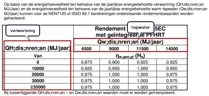 Het tweede voorbeeld is iets eenvoudiger. In veel gevallen is de warmtebehoefte voor verwarming hoger dan de maximale waarde op de verklaring. Als dat in de laatste regel aangegeven is (of in tekstuele beschrijving op de verklaring), in dit voorbeeld > 35000 MJ/jaar, dan hoef je alleen te interpoleren voor tapwater.