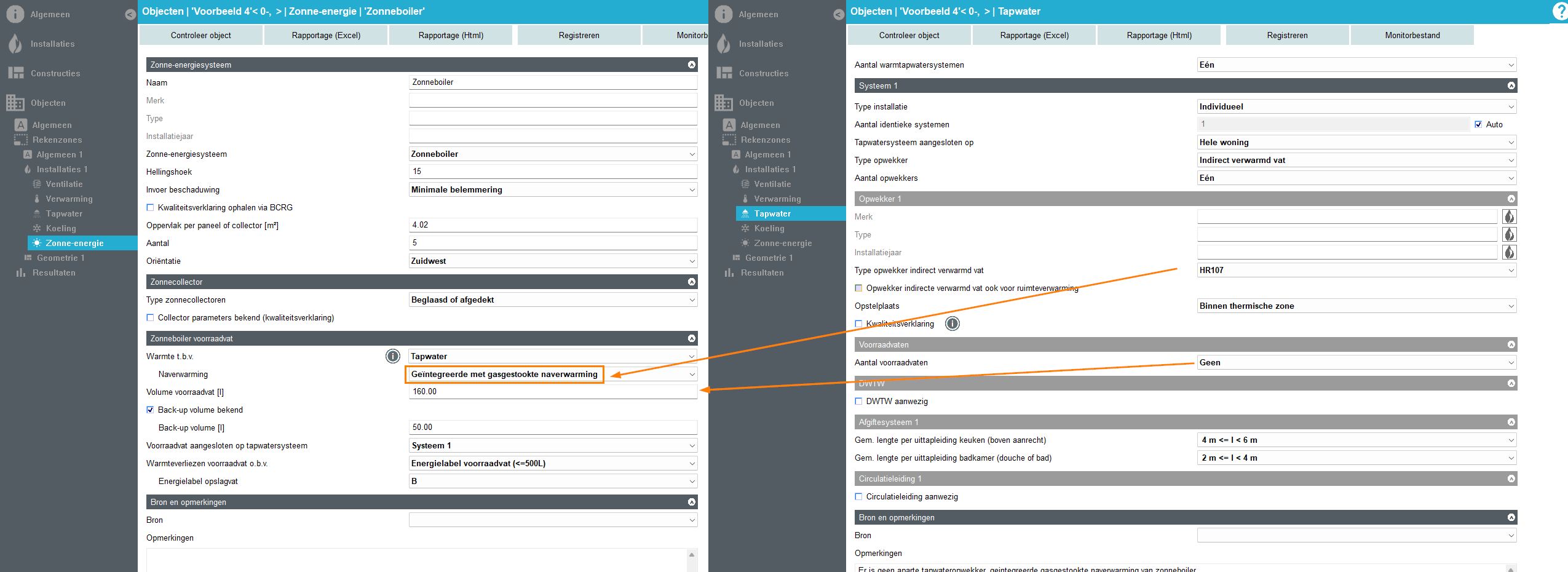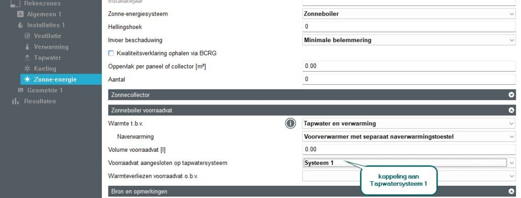 Bij het voorraadvat geef je aan dat de ‘Warmte t.b.v.‘ Verwarming en tapwater gebruikt wordt. Bij ‘Naverwarming’ geef je aan dat er een separaat naverwarmingstoestel is. Bij ‘Voorraadvat aangesloten op tapwatersysteem‘ kies je het tapwatersysteem dat op de zonneboiler aangesloten is.