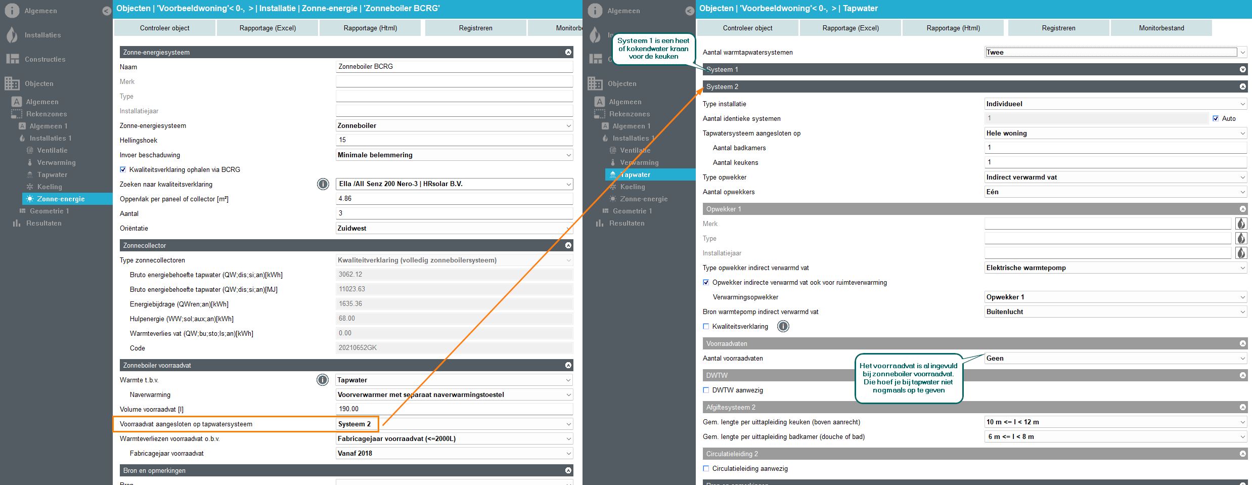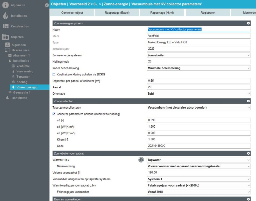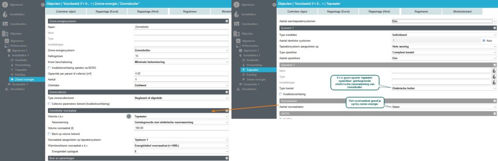 Al verschillende keren heb ik de verwarring gehad bij deze situatie: als je bij “tapwater” een indirect verwarmd vat invult, waarbij ook een zonnecollector aanwezig is, dan kun je op twee plekken een voorraadvat (boiler) invullen: zowel bij de zonnecollector als bij tapwater bij het indirect verwarmde vat. Daardoor was ik onder de veronderstelling dat je in deze situatie de opwekker als een compleet toestel kon zien bij tapwater zodat je geen verdubbeling had in boilervaten. Echter begon ik nu te twijfelen omdat het in principe alsnog wel een indirect verwarmd vat is. Hoe moet je in deze situatie tapwater invullen?