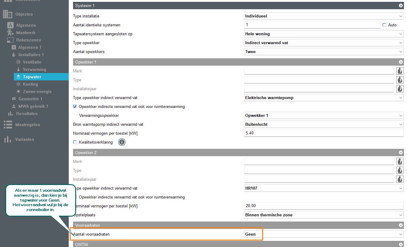 Zie volgende vraag wat je bij Voorraadvaten invult als het tapwatersysteem een indirect verwarmd vat is.