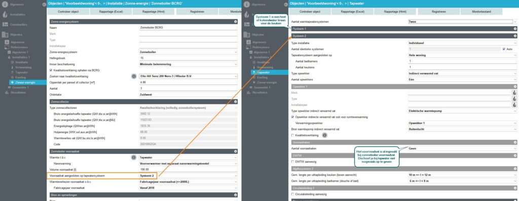 Dit voorbeeld heeft een zonneboiler, er is een kwaliteitsverklaring voor deze zonneboiler beschikbaar, deze is ingevuld via de koppeling met BCRG. De zonneboiler heeft een voorraadvat met een separaat naverwarmingstoestel, dat is een combi warmtepomp op buitenlucht. Deze warmtepomp is opgegeven in tapwatersysteem 2, voor de badkamer (tapwatersysteem 1 is een Quooker voor de keuken). Het voorraadvat van de warmtepomp vul je in bij Zonneboiler voorraadvat en hoeft je bij tapwater niet nog een keer in te vullen, dus kies je bij tapwater voor Geen bij het Aantal voorraadvaten.