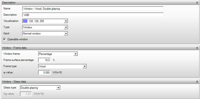 Here you define a U-value of a window frame based on a selected standard window type according to ISSO 8, table 7. If you know the U-value yourself, you can enter it directly.