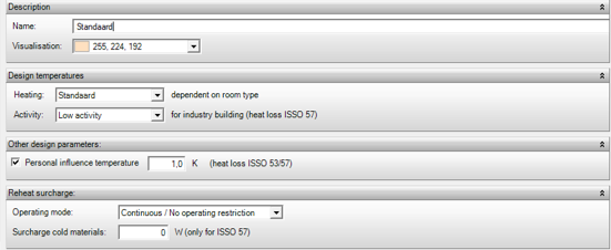 The room requirements template contains the test conditions or boundary conditions which are intended for the calculation. This includes parameters such as design temperatures, requirements on overheating hours, heating surcharges, etc.