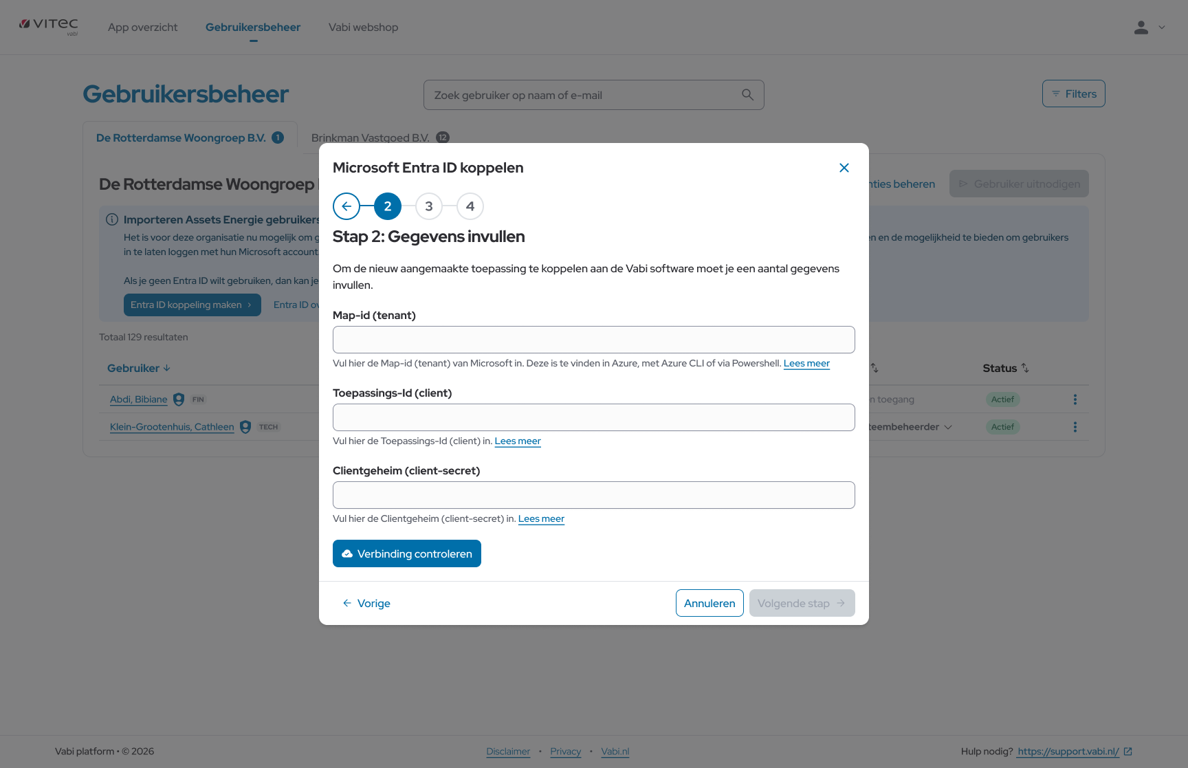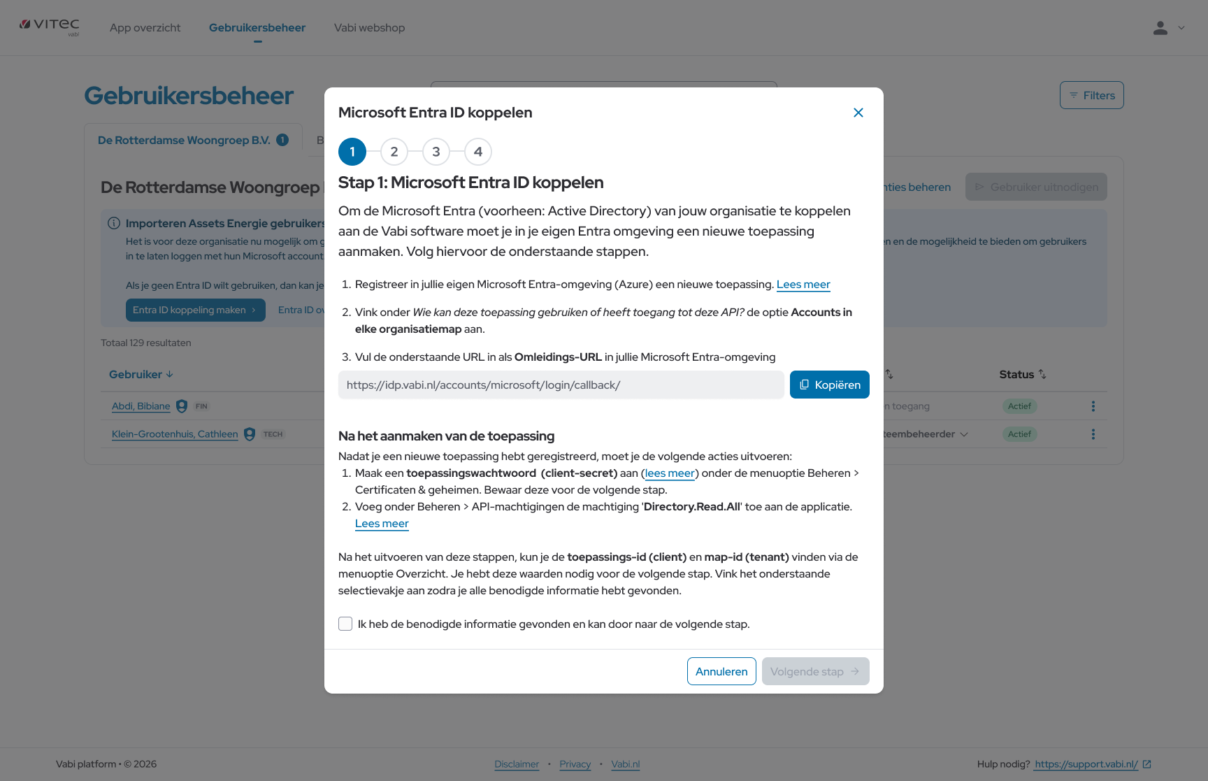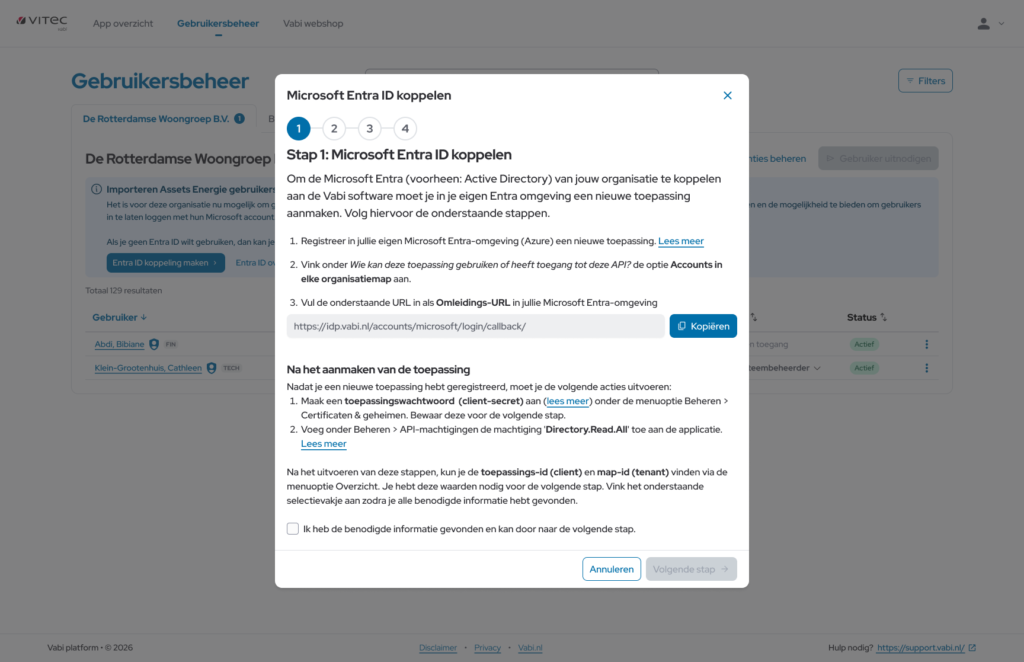 Stap 3: Inloggen in het Vabi platform voor instellen van Entra ID en het controleren en uitnodigen van gebruikers.