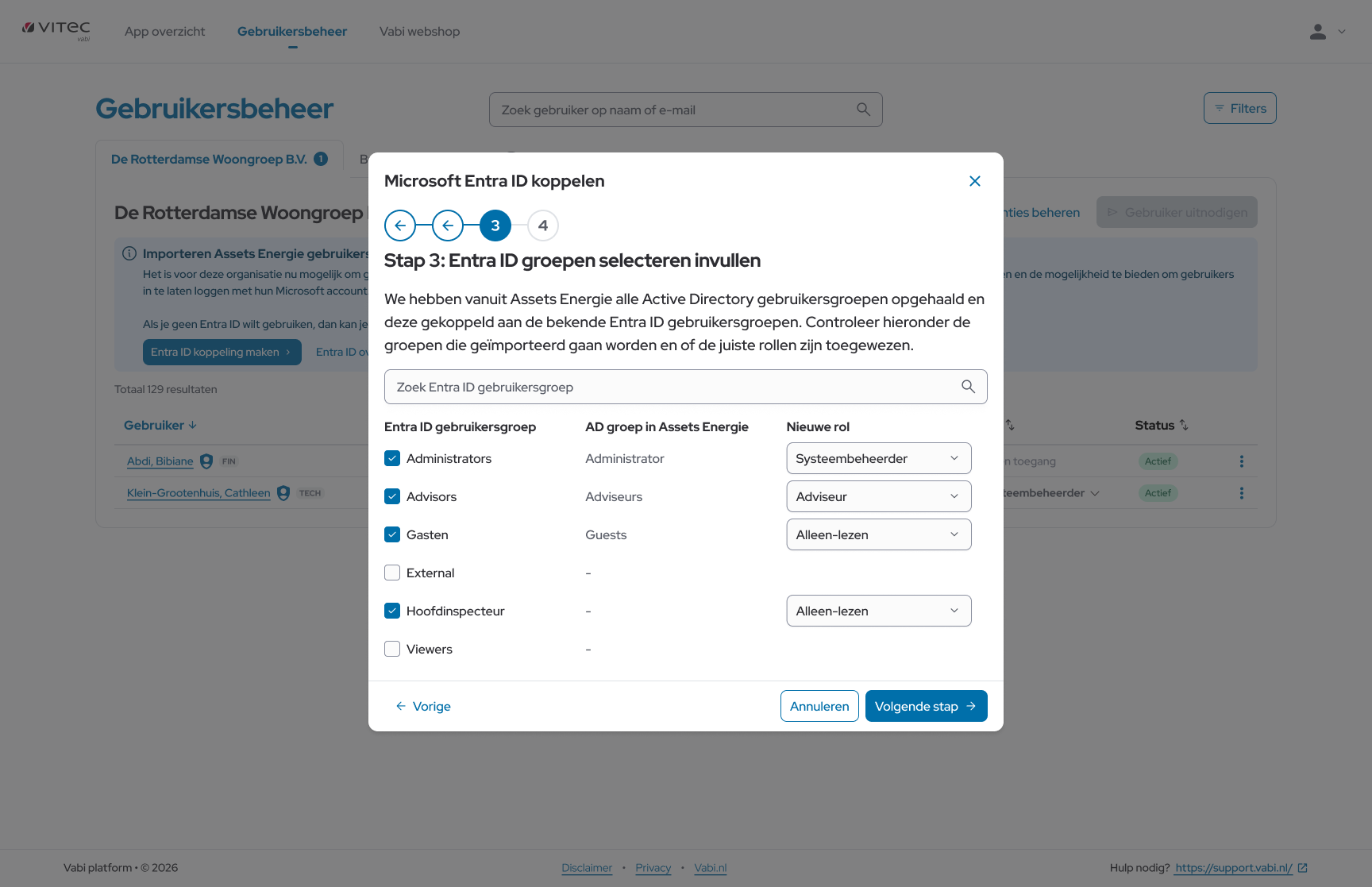 - Als de verbinding succesvol tot stand is gebracht, kan je door naar de volgende stap. In stap 3 kies je welke gebruikersgroepen uit Entra ID je wilt overnemen. Indien mogelijk tonen we ook als deze Entra ID groep in de on-premise software aanwezig is. Als dat het geval is zie je in de kolom ‘AD groep in Assets Energie’ de naam van deze groep. Selecteer welke groepen toegang moeten krijgen tot Vabi Assets Energie en geef deze groepen een rol.