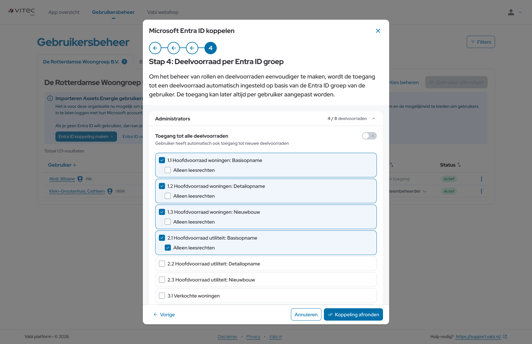 - In de laatste stap kan je per gekozen Entra ID groep kiezen tot welke deelvoorraden en groep toegang heeft. In het overzicht zie je eerst de gekozen groepen met daarbij tot hoeveel deelvoorraden de groep toegang heeft. Klap de groep open door erop te klikken om de deelvoorraad toegang te wijzigen.