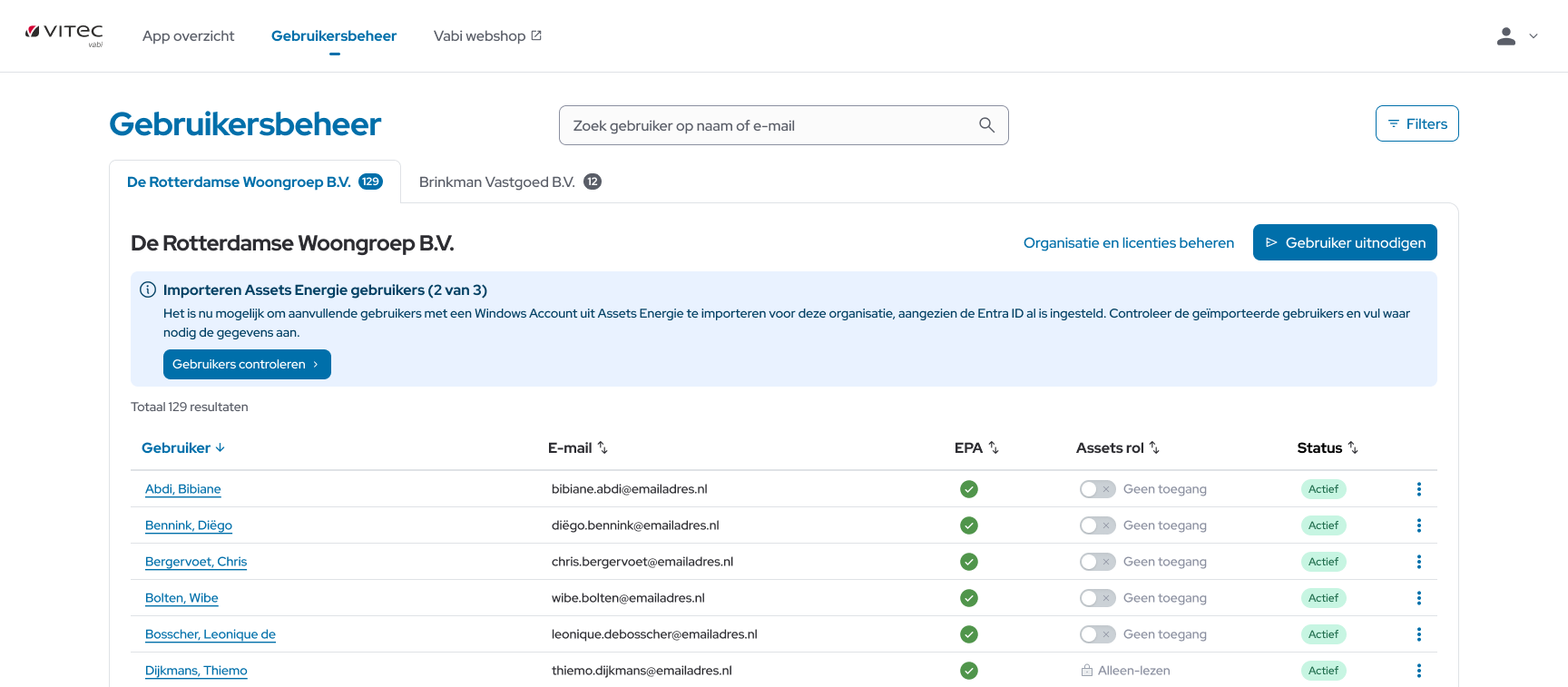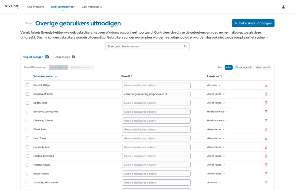 - Er opent een nieuw scherm waarin gebruikers gecontroleerd kunnen worden. Op het overzichtsscherm worden alle bestaande gebruikers vanuit de on-premise software getoond. Vanuit de on-premise software vullen we alle informatie in die we weten van een gebruiker. Als er informatie ontbreekt, dan kan dat in dit scherm worden ingevuld zoals het e-mailadres en de rol van de gebruiker. Gebruikers met een ingevuld e-mailadres kunnen dan worden uitgenodigd.
