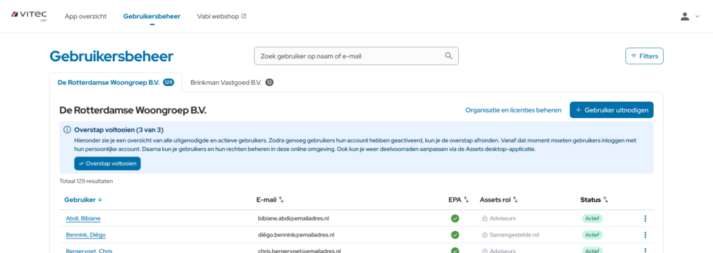 - Er opent een nieuw scherm waarin gebruikers gecontroleerd kunnen worden. Op het overzichtsscherm worden alle bestaande gebruikers vanuit de on-premise software getoond. Vanuit de on-premise software vullen we alle informatie in die we weten van een gebruiker. Als er informatie ontbreekt, dan kan dat in dit scherm worden ingevuld zoals het e-mailadres en de rol van de gebruiker. Gebruikers met een ingevuld e-mailadres kunnen dan worden uitgenodigd.