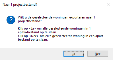Vervolgens verschijnt een venster met de vraag of je de geselecteerde woningen wilt exporteren naar 1 projectbestand. De woningen worden dan in het .epa opgeslagen als verschillende objecten.
