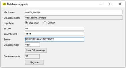 2. Voer als klantnaam de databasenaam in (let op: vabi wordt al standaard ingevuld). U kunt de databasenaam inzien via SQL Server Management Studio.