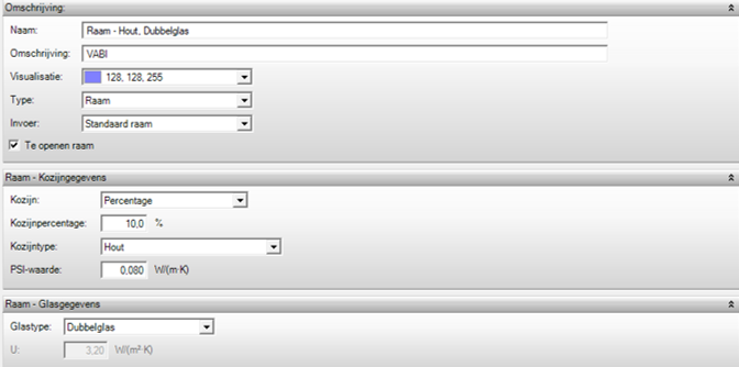 Hier definieer je een U-waarde van een kozijn op basis van een gekozen standaard kozijntype conform ISSO 8, tabel 7. Mocht je zelf een U-waarde kennen, kun je deze invoer op eigen waarde zetten.