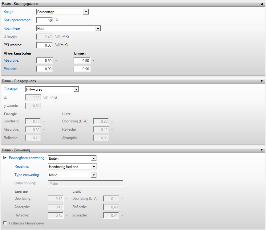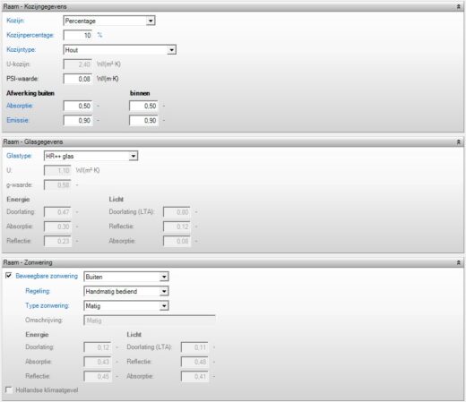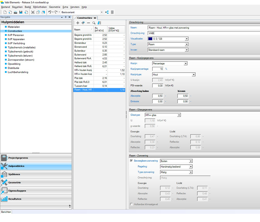 De invoer voor de standaard ramen is in Vabi Elements 3.4 snel en makkelijk. Je kiest voor de meegeleverde glastypen of vult zelf de specificaties in. Dit geldt ook voor de zonwering. In samenwerking met zonweringleveranciers zijn standaard zonweringtypen bepaald die je kunt kiezen; slecht, matig of goed. Als specificaties zijn de huidige marktwaarden toegepast op deze categorieën. Uiteraard kun je deze waarden naar eigen inzicht handmatig aanpassen.