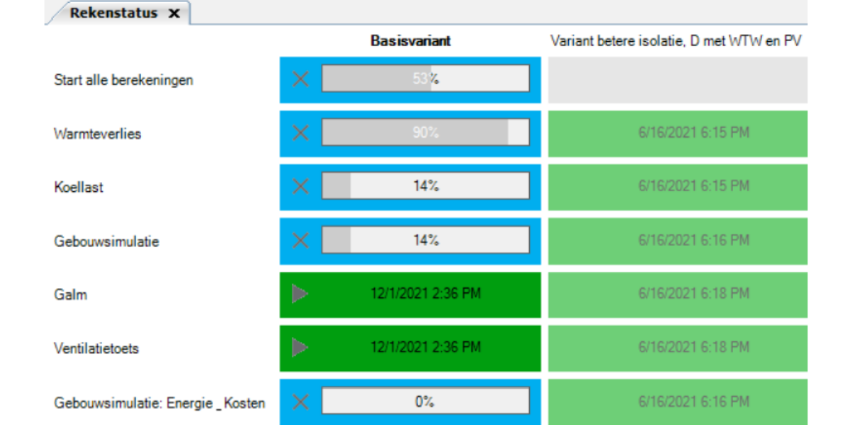 Je kunt alle berekeningen starten door op de ‘Start alle berekeningen’ knop te klikken. Het is ook mogelijk een andere berekening naast de huidige berekening te starten, wanneer er al een berekening is begonnen.