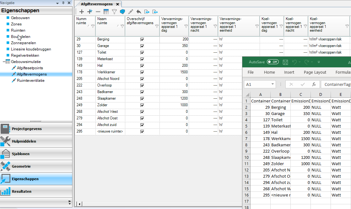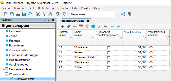 De ventilatiehoeveelheden, afgifte vermogens en setpoints kunnen nu in het eigenschappenscherm worden overschreven. Op deze manier kan eenvoudig en snel de invoer aangepast worden zonder dat je een nieuw sjabloon moet aanmaken en koppelen. Gegevens kunnen ook geëxporteerd worden naar Excel, en na bewerking weer geïmporteerd worden. Het handmatig aanpassen van gekozen sjablonen in het scherm eigenschappen ruimten is hierdoor niet meer nodig en zal in de toekomst ook niet meer mogelijk zijn