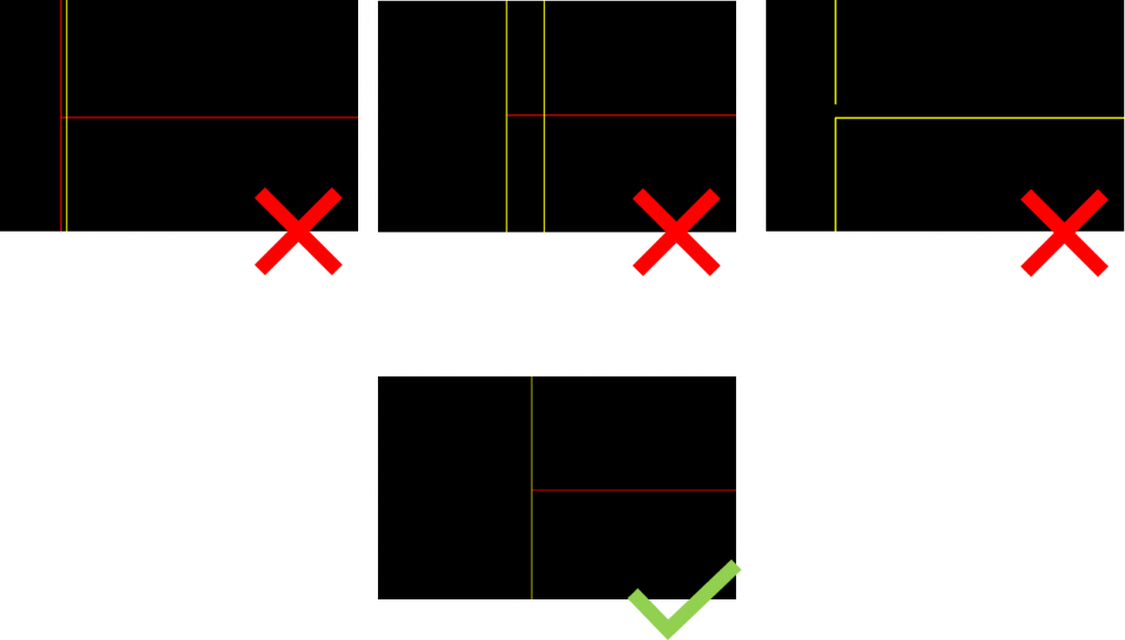 - Zogenaamde dubbellijnige tekeningen, waarbij wanden uit meer dan één enkele lijn bestaan, moeten worden voorkomen. Wanneer lijnen over elkaar heen worden getekend, levert dit problemen op als een lijn halverwege een wand ‘stopt’;