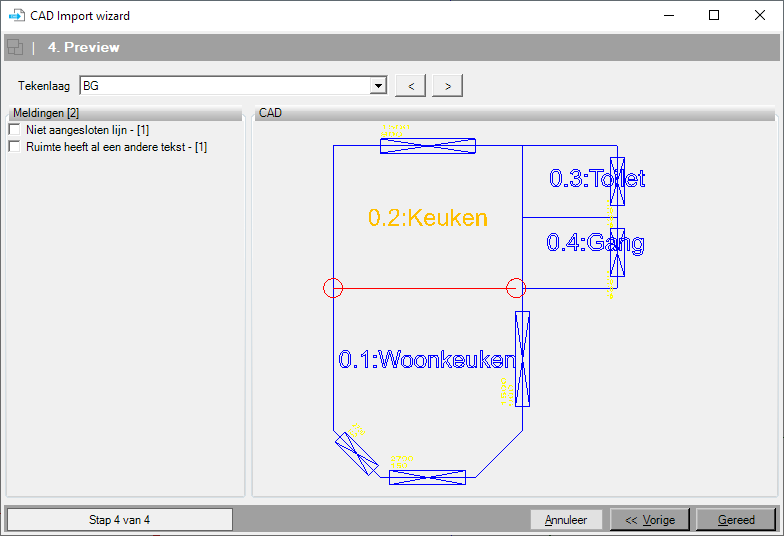 Wanneer er meer dan één tekstlijn in een ruimte voorkomt, wordt er een melding gegeven dat de ruimte meerder ruimtenamen bevat. Hij leest alleen de eerst geplaatste tekst en houdt deze als ruimtenaam aan. Wanneer dit niet de juiste ruimtenaam is, kun je dit onder Stap 3: Koppelen > Ruimten aanpassen, of in de CAD tekening de overbodige teksten verwijderen.
