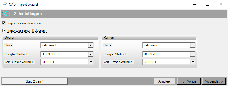 In stap 1 geef je op welke CAD-tekening je wilt importeren. Als er een juist bestand geselecteerd is, kan er op Volgende geklikt worden.