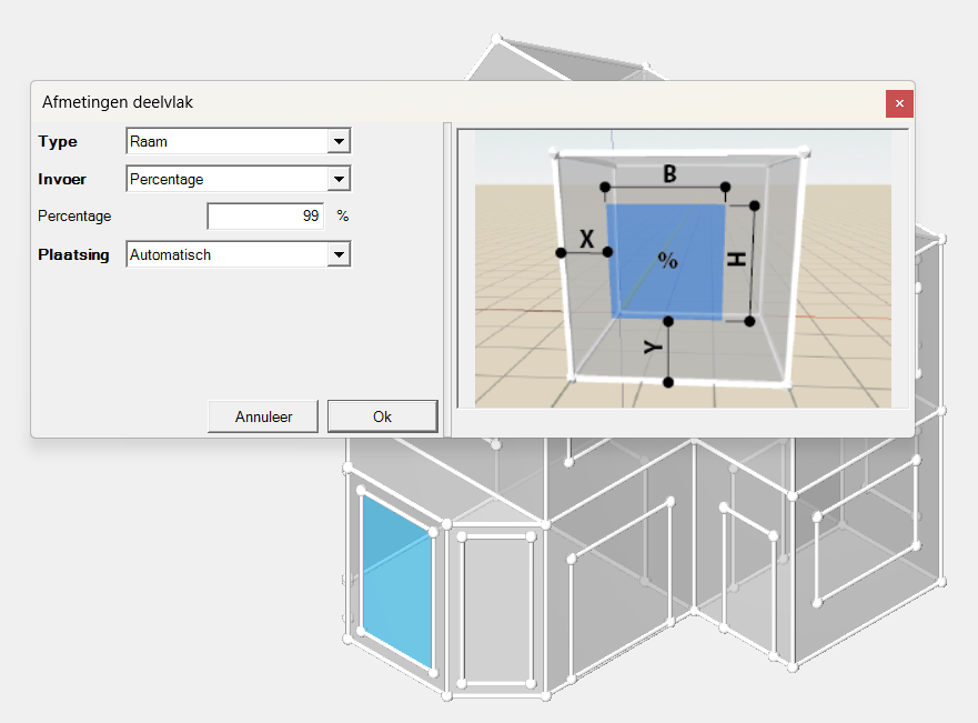 3) Kies voor de invoer ‘percentage’ en zet deze op 99%. Nadat je op OK klikt, verschijnt het raam of de deur.