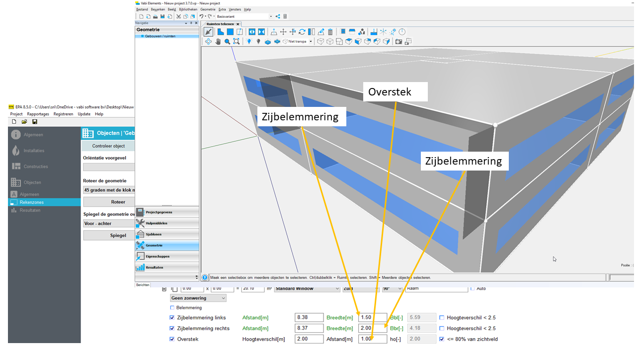 - Verticale luifels worden als zijbelemmering links/rechts geëxporteerd. Hiermee wordt ook al berekend of het vinkje hoogteverschil <2,5 aan/uit moet staan.