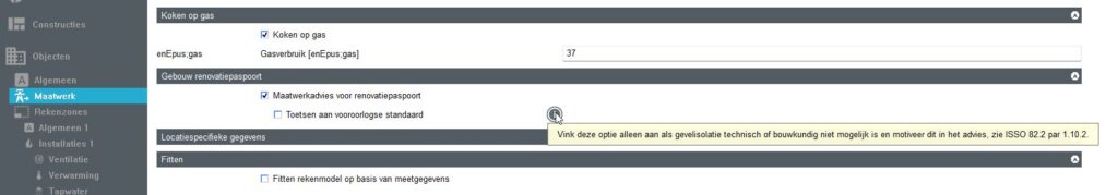 Als het vinkje uit staat wordt er niet automatisch een verbruik voor elektrisch koken meegenomen. Dit wordt meegenomen in de IWP. Momenteel is het nog niet mogelijk om van koken op gas af te stappen met maatregelen. Het verbruik is voor de meeste huishoudens (zeer) klein ten opzichte van het totaal, maar als je het in de maatwerkadvies berekening mee wilt nemen, dan moet dat in een kopie van de woning waar je koken op gas uit zet en de IWP aanpassen bij Rekenzone – MWA gebruik.