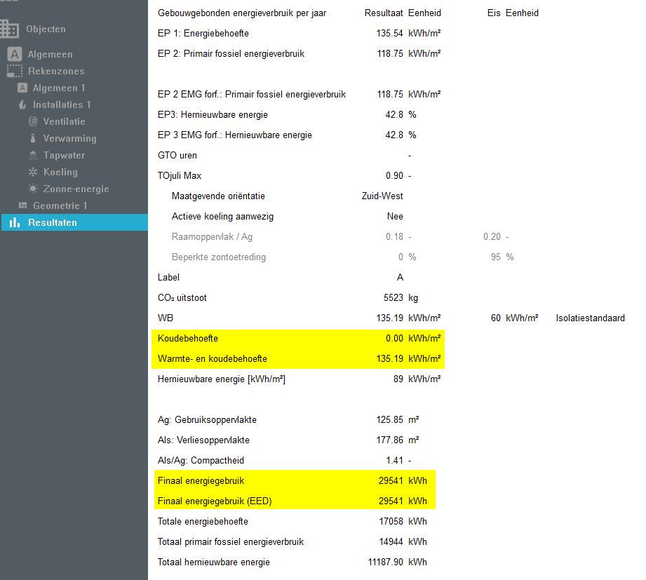 • Koudebehoefte + warmtebehoefte [EH+C;nd kWh/m² per jaar]: deze nieuwe indicator wordt nu berekend en getoond bij de resultaten. Net als bij warmtebehoefte lijkt de berekening erg op de EP1, maar voor de warmte- en koudebehoefte wordt het toegepaste ventilatiesysteem wel meegenomen (bij de EP1 wordt altijd met ventilatiesysteem C gerekend).