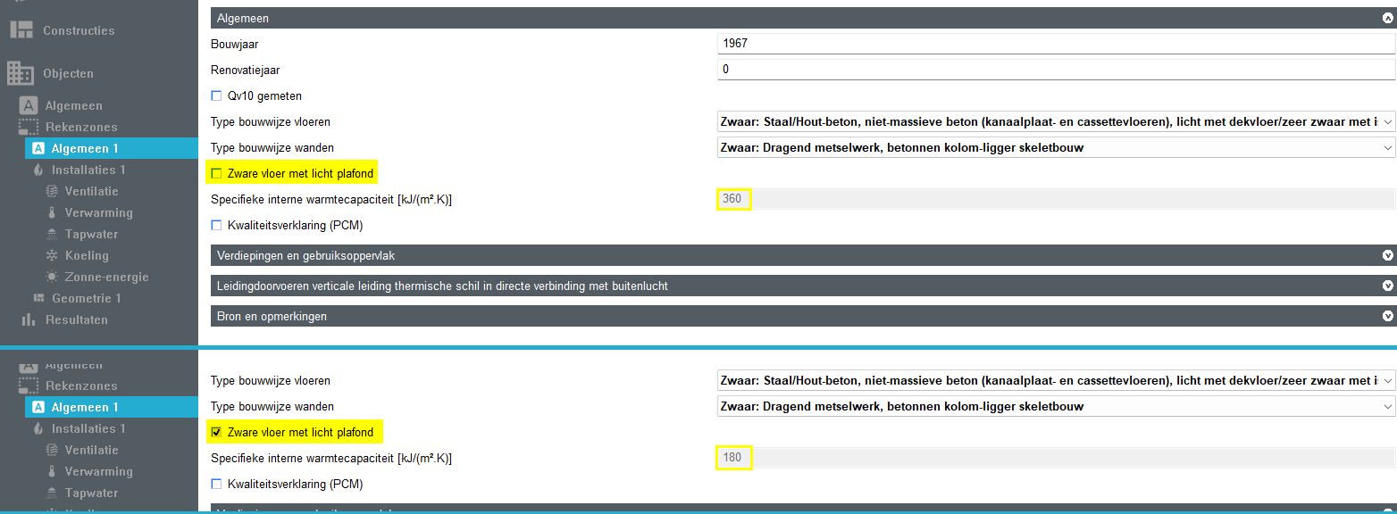 Voor woningbouw komt er een toevoeging op de bepaling van de specifieke interne warmtecapaciteit. Als de vloer van de verdieping erboven lichter wordt uitgevoerd dan de vloer (van de rekenzone), moet er met de waarden gerekend worden wat onder Utiliteit valt als verlaagd plafond (zie opmerking c onder tabel 7.10). Hiervoor komt in de GUI een checkbox bij ‘Zware vloer met licht plafond