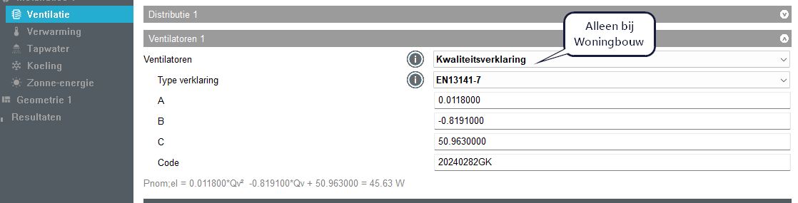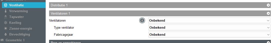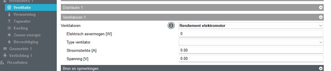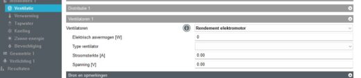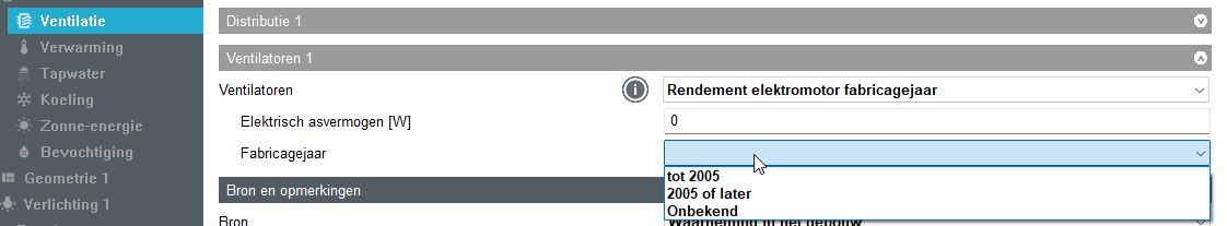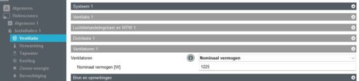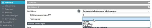 Je kunt kiezen voor het nominaal vermogen in te vullen, of via het rendement van de elektromotor uit te rekenen. Of je kunt Onbekend kiezen, dan wordt er met een forfaitair ventilatorvermogen gerekend. Voorheen werd gecontroleerd of het berekende rendement van de elektromotor niet lager was dan op basis van het fabricagejaar, die controle is nu vervallen.
