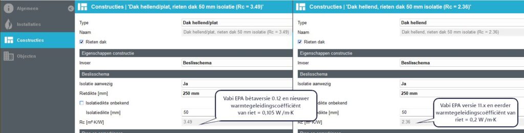 De λ-waarde van riet is aangepast naar 0,105 W / m ·K (voorheen 0,2). Daardoor krijgen gebouwen met rieten daken in bètaversie 0.12 een betere (lagere) EP2. Hoe groot dat effect is, is afhankelijk van de dikte van het riet en van het oppervlak van het rieten dak (in verhouding tot de andere verlies oppervlakten).