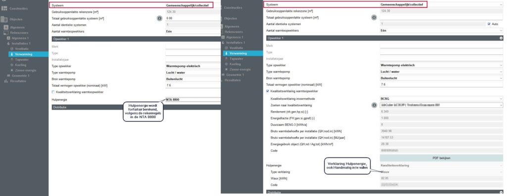 Je kunt bij verwarming nu ook van een gemeenschappelijke opwekker de hulpenergie (Waux) invullen. Als er geen verklaring voor hulpenergie is, dan kies je NTA 8800 en wordt de hulpenergie forfaitair berekend volgens de NTA 8800 rekenregels.
