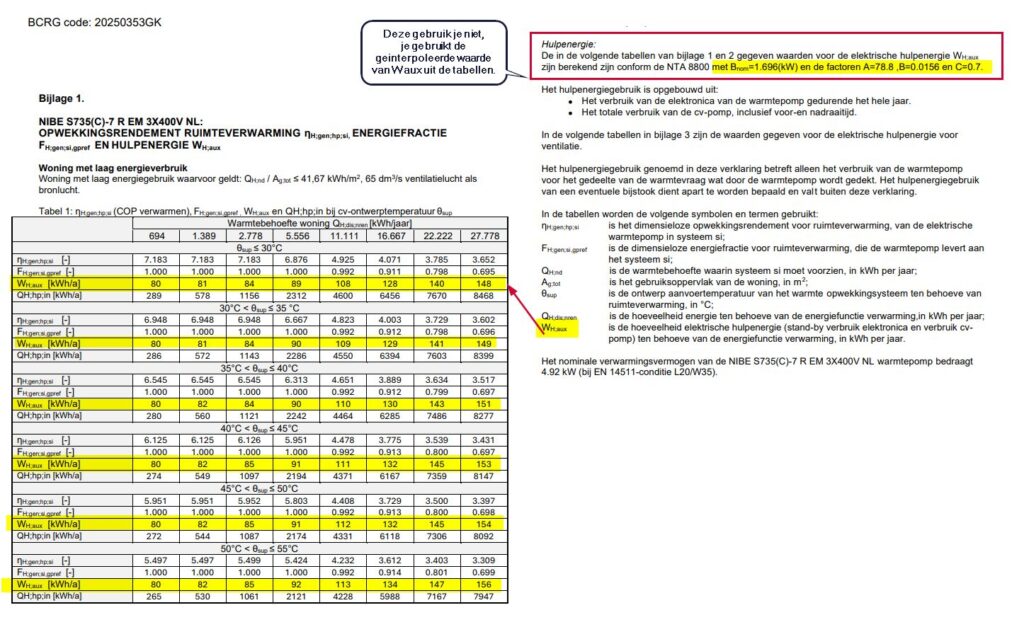 Bij verklaringen van elektrische warmtepompen zien we dat de constantes A, B, C en Bnom in de toelichting / onderbouwing van de verklaring (ook) gegeven zijn, maar dat de tabellen de hulpenergie in Waux in kWh per jaar geven.