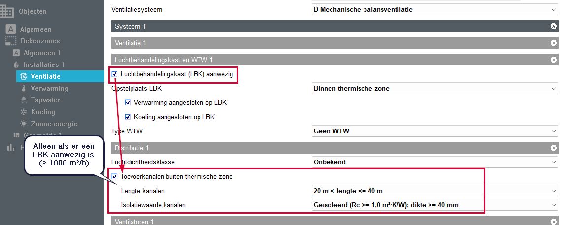 Kanalen buiten de thermische zone moet je opnemen indien er een LBK (> 1.000 m³/h) aanwezig is. Een LBK komt alleen voor in combinatie met een ventilatiesysteem B of D.