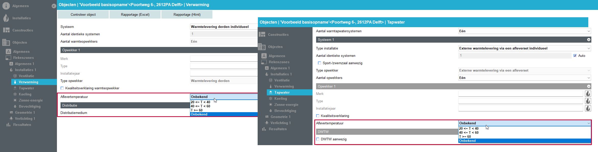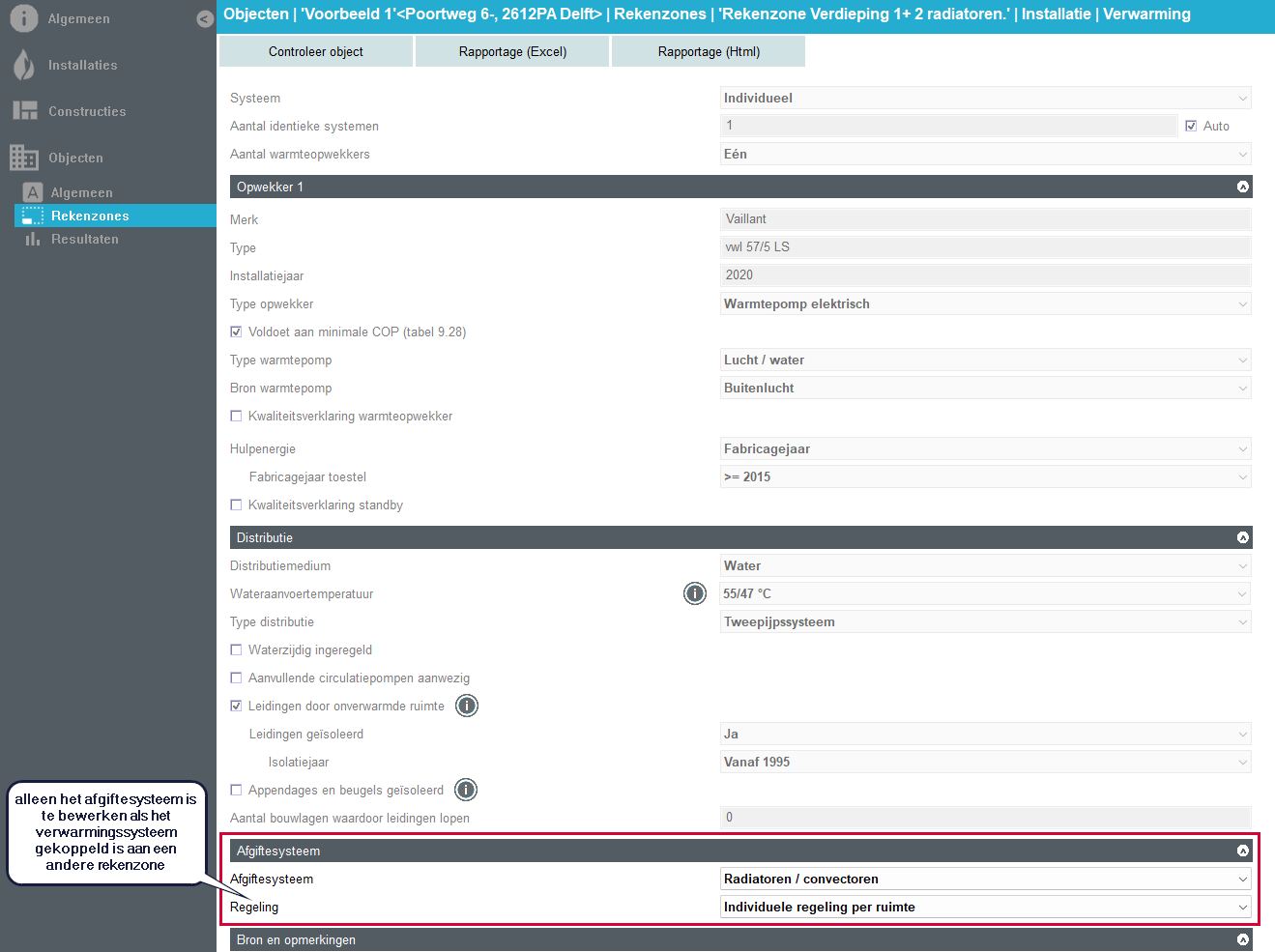 Als je “Verwarming heeft eigen afgiftesysteem” aan vinkt, dan kun je de opwekker(s) en distributie niet aanpassen, maar je kunt wel het afgiftesysteem aanpassen. De wateraanvoertemperatuur is in alle rekenzones gelijk, zie bericht KEGO hieronder, en moet worden gebaseerd op het afgiftesysteem met de hoogste wateraanvoertemperatuur dat aangesloten is op de verwarmingsinstallatie. Zie daarvoor de tekst in het opnameprotocol paragraaf 9.3.4 Ontwerptemperatuurklasse.