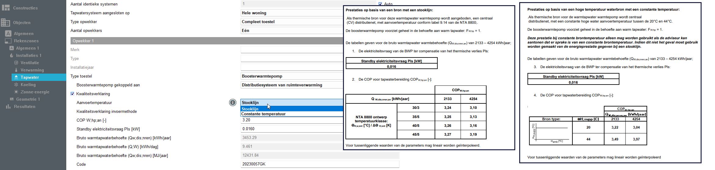 Het is vanaf nu mogelijk om bij een kwaliteitsverklaring van een boosterwarmtepomp niet alleen een stooklijnregeling te gebruiken, maar ook als de regeling van het verwarmingssysteem een constante temperatuur heeft. Dit betreft de regeling van de distributietemperatuur van het gemeenschappelijke verwarmingssysteem, maar geef je op bij tapwater omdat dit alleen relevant is bij toepassing van een boosterwarmtepomp. De NTA 8800 rekent standaard met een stooklijn.