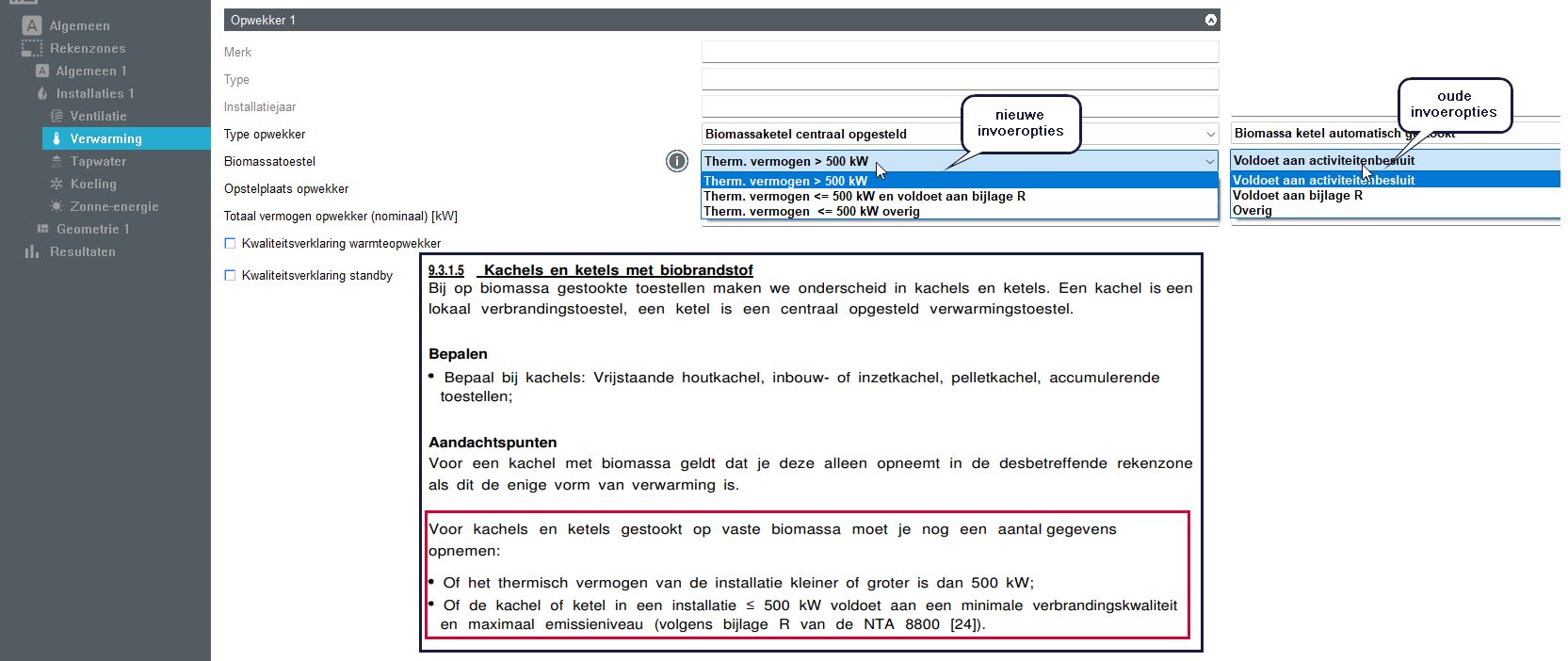 De oude invoeropties sloten aan bij het opnameprotocol 5e druk (en eerder),  paragraaf  9.3.1.5 Kachels en ketels met biobrandstof