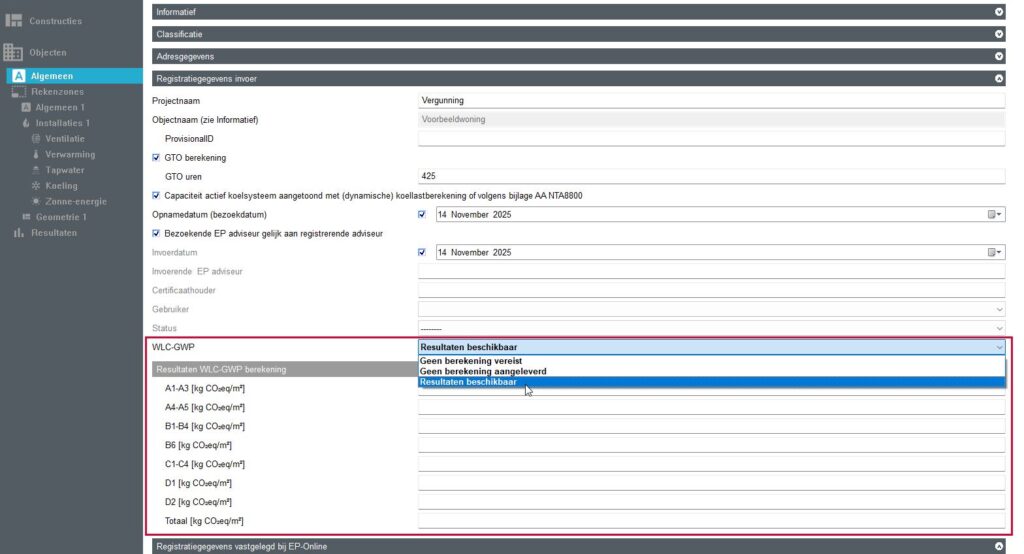 Indien beschikbaar moet je het resultaat van de Whole Life Cycle – Global Warming Potential (WLC-GWP) berekening invoeren in de EP berekening. De berekening van de WLC-GWP zal doorgaans door een gespecialiseerd adviseur worden uitgevoerd. Om die berekening te kunnen maken heeft de gespecialiseerde WLC-GWP adviseur op voorhand al het berekende energiegebruik per energiedrager nodig van de EP-adviseur. Mede met deze gegevens kan de WLC-GWP berekening gemaakt worden. De WLC-GWP adviseur geeft het resultaat van de WLC-GWP weer door aan de EP-adviseur.