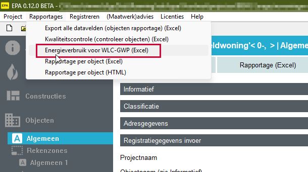 Alle benodigde informatie uit Vabi EPA die als input voor een MPG berekening gebruikt moet worden, is te vinden via het menu Rapportages en kies voor ‘Energieverbruik voor WLC-GWP (Excel)‘, zie afbeelding hieronder.