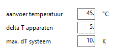 Met bovenstaande waarden start de aanvoertemperatuur op 45°C, in het stelsel neemt door warmteverlies naar de omgeving de temperatuur in de leidingen af. Per apparaat is er een dT van 5K. Het eerste apparaat krijgt dus een aanvoer van 45°C en een retourtemperatuur van 40°C. Een apparaat dat verder in het toevoerstelsel zit kan bijvoorbeeld een aanvoertemperatuur van 42°C hebben en maakt daar dan 37°C van. Zodra, met bovenstaande ingevoerde waarden, de retourtemperatuur (45 – 10 =) 35°C of lager wordt dan wordt de melding gegeven.
