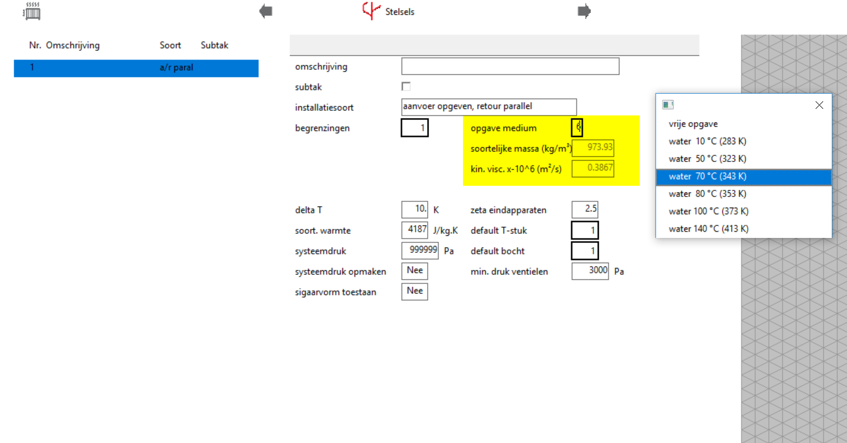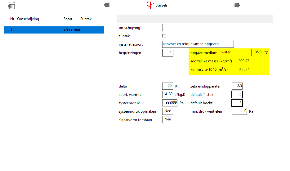 Voorheen kon er enkel uit een aantal watertemperatuurtrajecten worden gekozen. Vanwege van toepassingen met lagere temperatuursystemen, waar de selectie van de temperatuur een grote impact heeft, is de software aangepast. In de stelselgegevens kun je nu zelf de watertemperatuur vrij instellen, de resulterende gegevens (soortelijke massa en viscositeit) zal de software berekenen. Dit maakt de uitkomsten van de berekening bij lage temperatuursystemen een stuk nauwkeuriger.