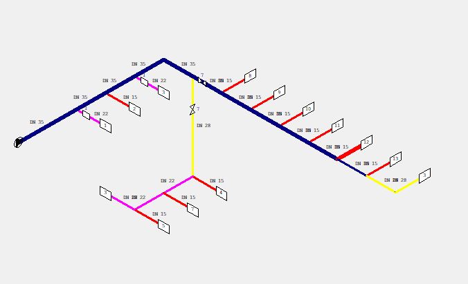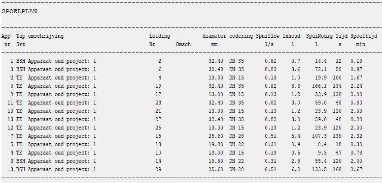 Hiervan is de eerste leiding de dikste dus deze moet een minimale snelheid van 1.5 m/s hebben. Hiermee wordt dus ook de flow, de totale hoeveelheid water en de doorspoel tijd bepaald. Vervolgens wordt de op één na kortste tak bepaald. Van deze tak hoeven echter de leidingen die gemeenschappelijk zijn met de voorgaande tak niet nog een keer gespoeld te worden. De flow wordt dus bepaald door het garanderen van een snelheid van 1.5 m/s in de eerste nog niet gespoelde leiding